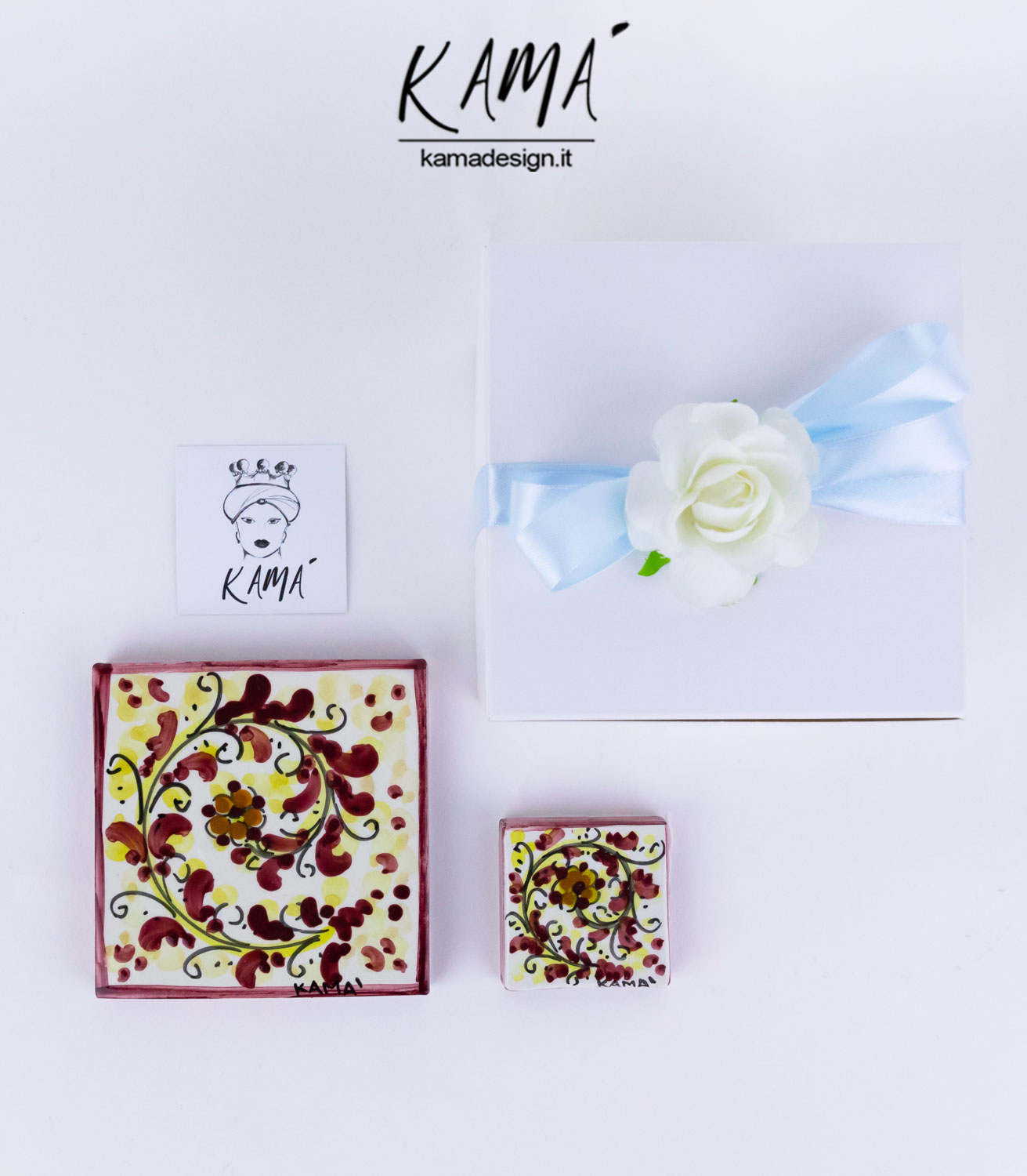 La maiolica siciliana oltre ad essere un elegante pezzo artistico di pregio si presta bene per molti utilizzi: la bomboniera infatti, oltre che a essere un simbolo di ringraziamento, può essere utilizzata come poggiapentola, elemento di arredo, e nel caso delle maioliche più piccole 5×5 cm si può sceglire la variante con magnete.